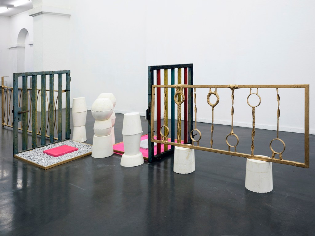 „Ach.“, used fences, gold spray, modeling clay, plaster, colored sand, 6 meters x 2 meters x 1.20 meters