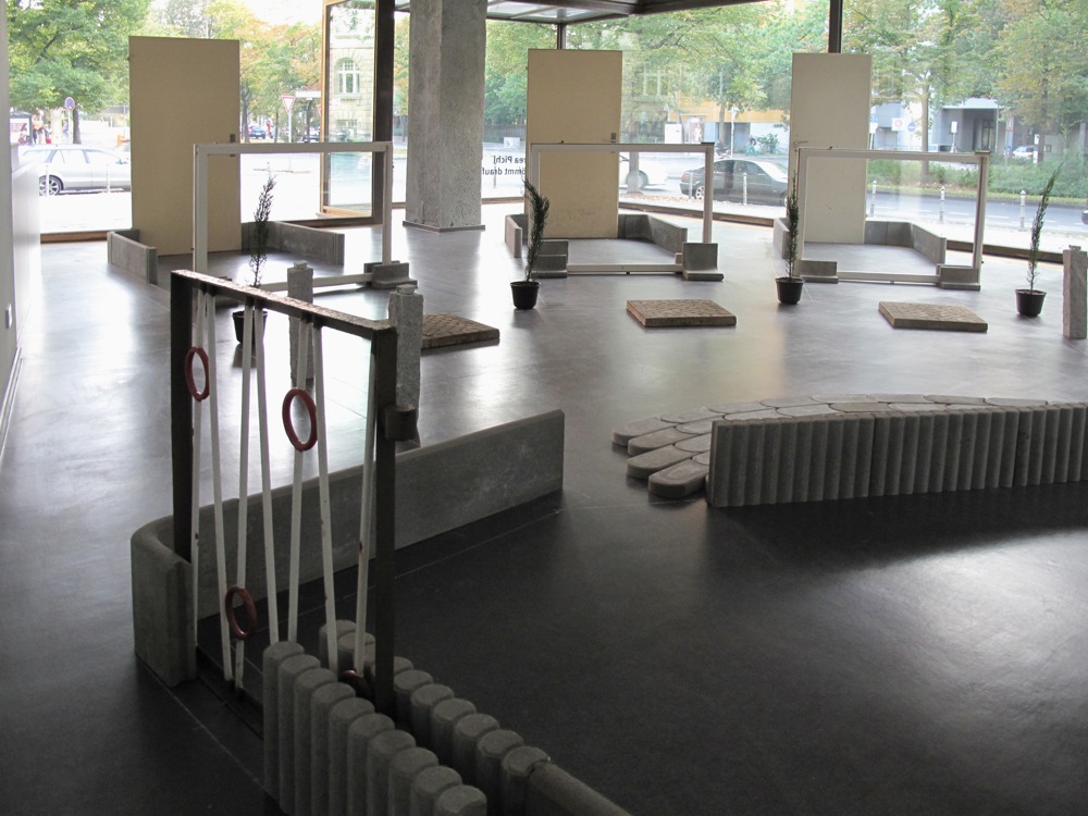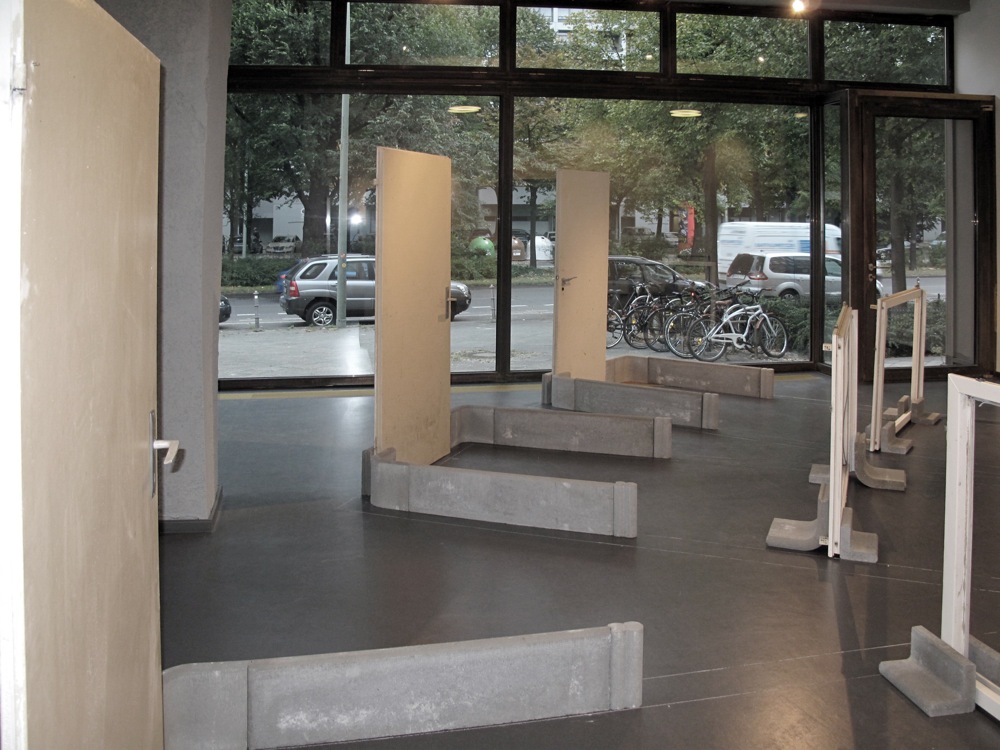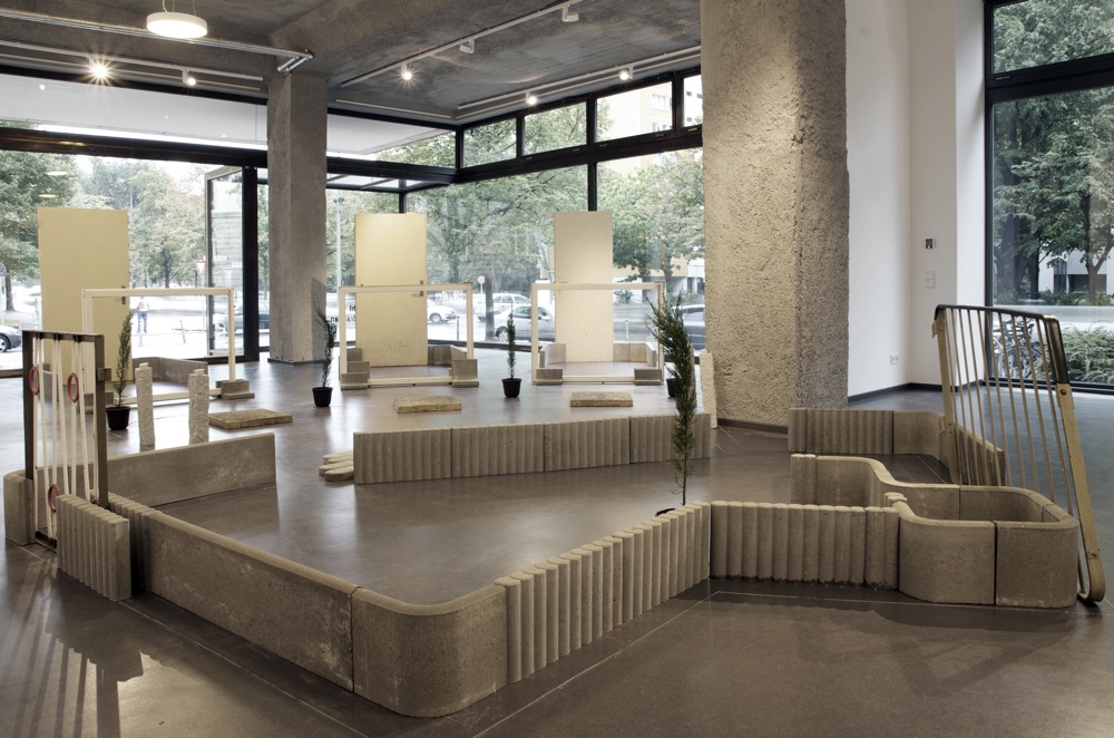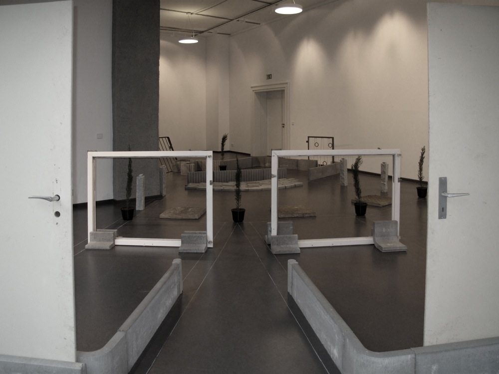Die Einschreibung des Grundrisses des Arbeiterclubs dient Andrea Pichl auf einer zweiten Ebene als Raster für die Errichtung einer eigenen, künstlerisch motivierten Architektur. Dazu verwendet sie verschiedene Betonelemente aus dem Baumarkt, die vorwiegend zur Einfassung von Beeten verwendet werden, sowie Fenster, Türrahmen, Gehwegplatten und Treppengeländer, die sie aus einem verlassenen DDR-Plattenbau in Storkow für die Ausstellung sicherstellte. Das Sammeln und Neukombinieren von Elementen genormter Architektur gehört zu den zentralen Themen der Künstlerin, denen sie in immer neuen Aspekten nachgeht. Sie versteht ihre Installation, zu der im Übrigen noch die bereits vorhandene Arbeit Wegvon 2012 aus tapeziertem und durchlöchertem Rigips samt konserviertem Schutt gehört, als körperlich zu erfahrenden Eingriff in die Architektur des Ausstellungsraums. Ganz bewusst stellt sie der ikonischen Architektur Mendelssohns ein extrem banales Vokabular von Bauformen gegenüber, das der Mensch zur eigenen Zurichtung entworfen hat.