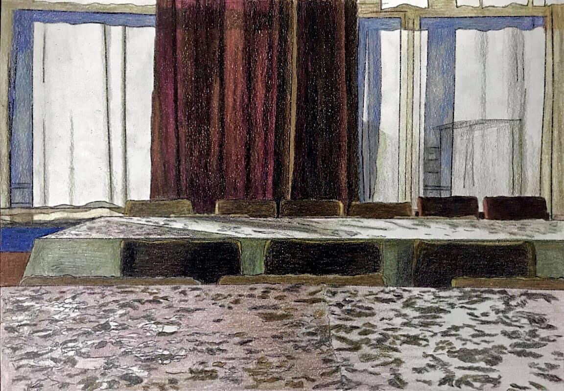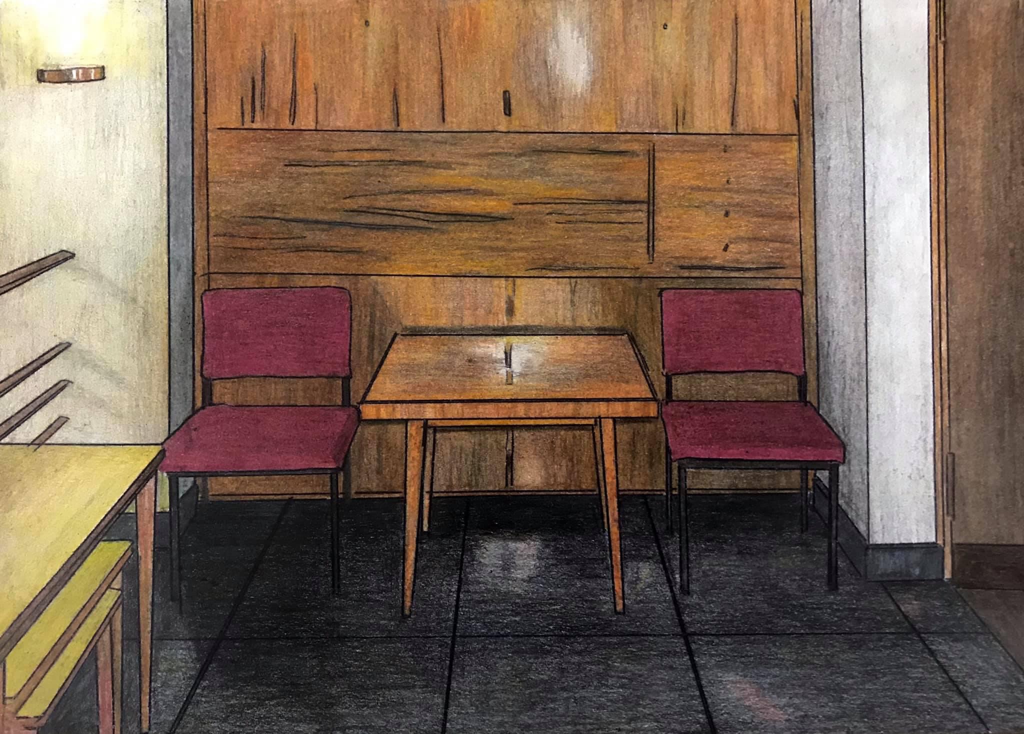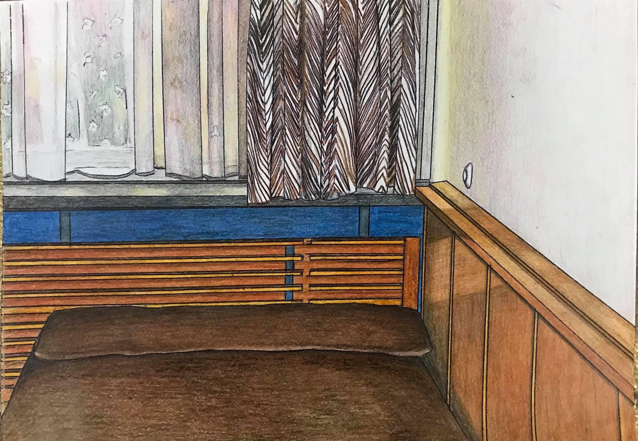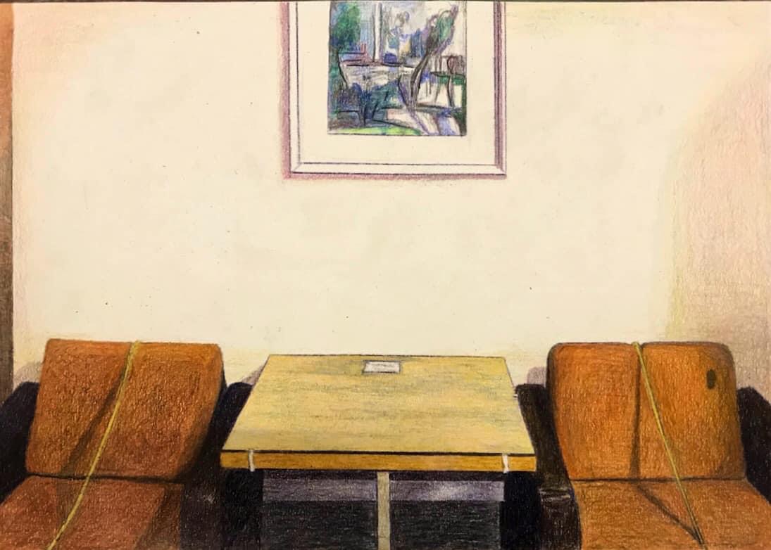 Die Zeichnungen gehören zu einer Serie von 30 Zeichnungen „Stasizentrale Nr. …“ und sind nach Abbildungen gezeichnet, die Andrea Pichl in der Stasizentrale fotografiert hat und die Ausschnitte des Interieurs und den Gestaltungsvorlieben der Stasi in der DDR zeigen.