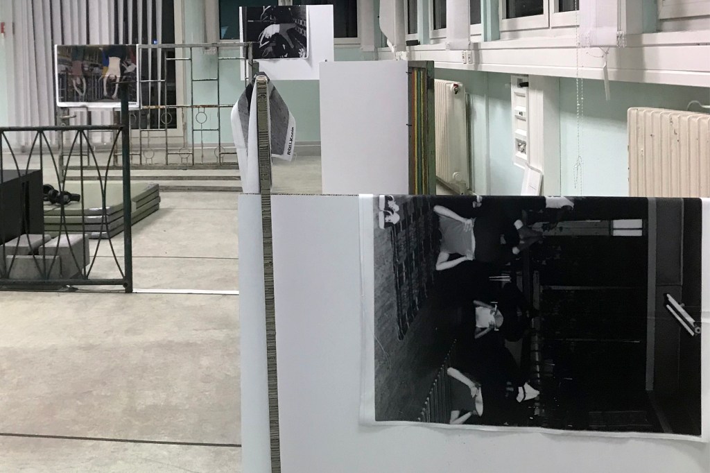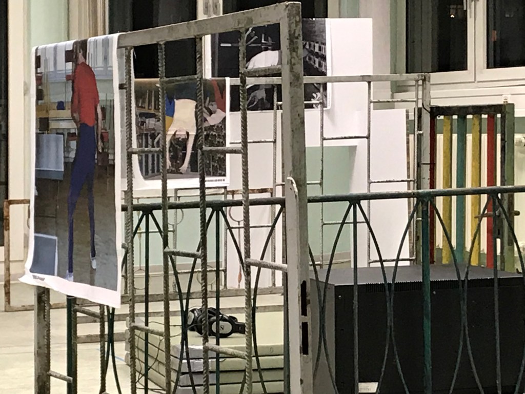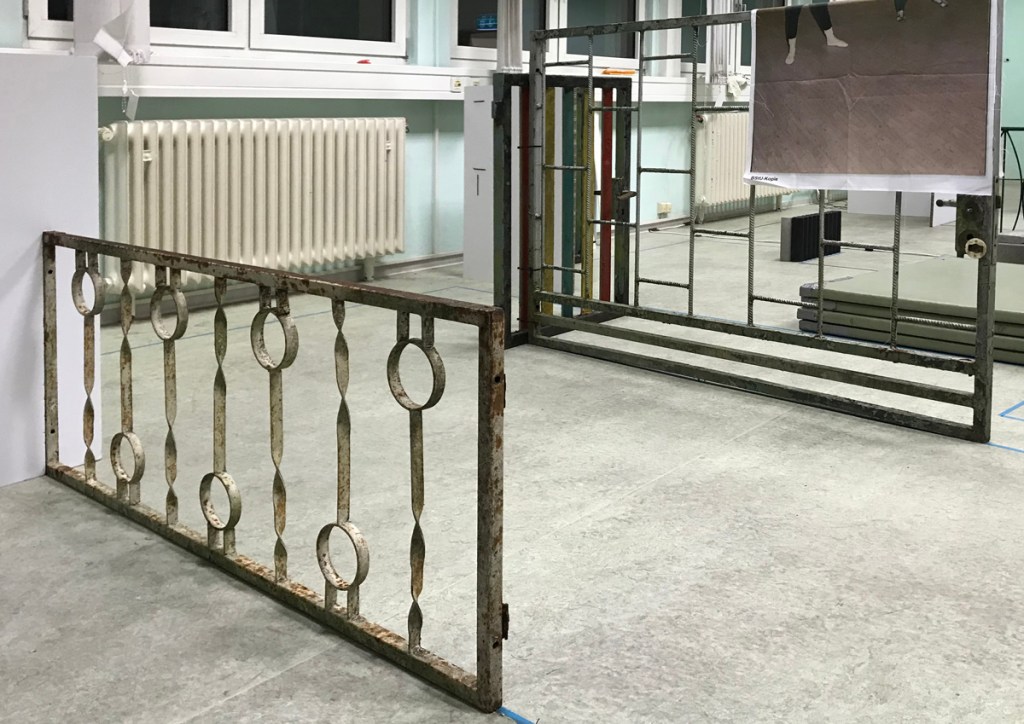 private used fences from GDR – time, prints on fabric Stasi people during sports exercises at former gym Stasi, Campus für Demokratie, BStu, Berlin 2019