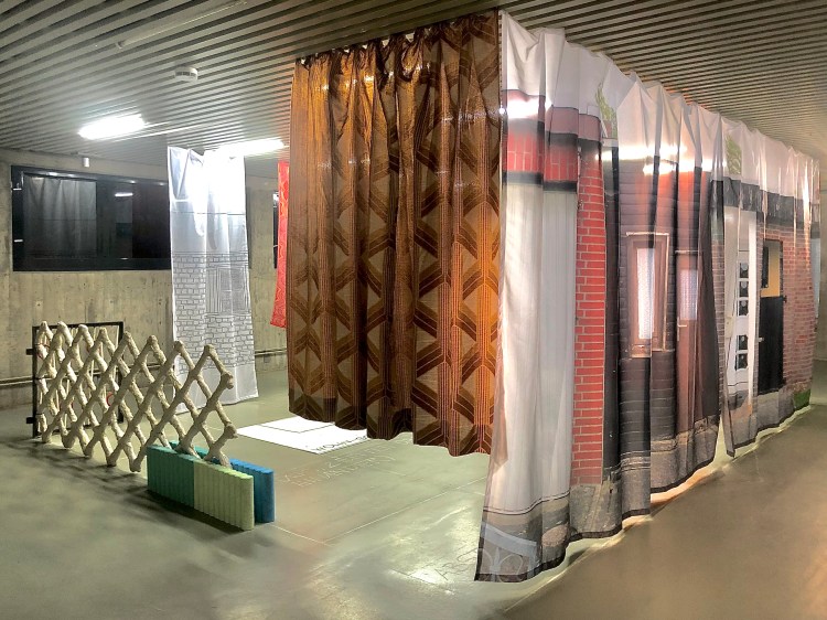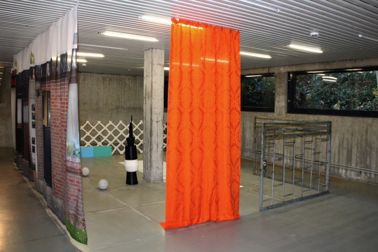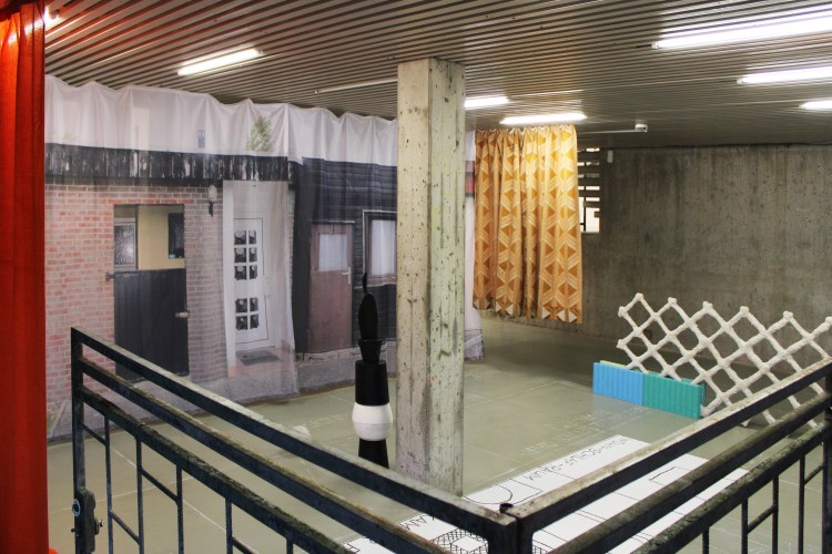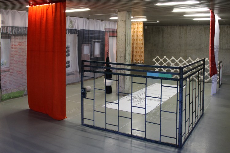 „The Berlin artist Andrea Pichl has created a work with reference to Wilhelmshaven. She took the floor plan as well as photographs of the makeshift homes in the Wilhelmshaven railroad line as the starting point for her installation „Zweck und Mittel und Norm“ („Purpose and Means and Norm“). The makeshift homes, created on a floor plan of about 20 square meters, were intended to be „tolerable accommodations for those affected by the air war.“ They were built in many places by the Deutsches Wohnungshilfswerk, which was founded in 1943. Bauhaus architect Ernst Neufert (1900-1986) designed the construction plan and specified the building material with standard specifications. In her installation, Andrea Pichl supplements the floor plan of an exemplary makeshift home with secular design elements from different eras.“